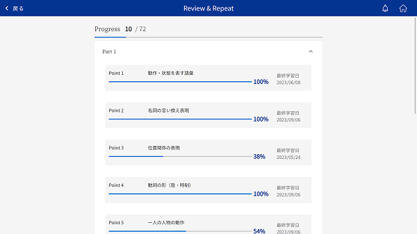 ▲72の学習ポイントごとに到達度を一覧で確認できます。
