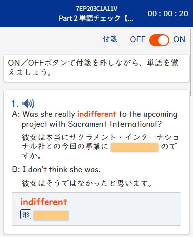付箋を外しながら、TOEIC本番レベルの例文の文脈ごと、単語を覚えていきます。音声も活用することで、単語知識だけではなく、リーディング力・リスニング力も含めた実践力も引き上げます。