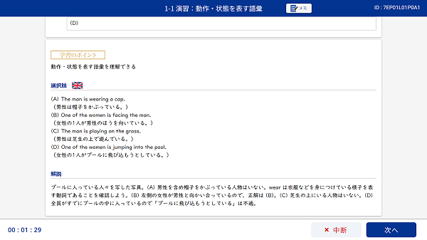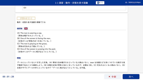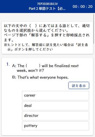 4択の問題形式で、単語の知識を確認します。ここでも、例文形式なので、単語力・実践力の両方を高めます。苦手な方は、先に訳を表示して解くこともできます。