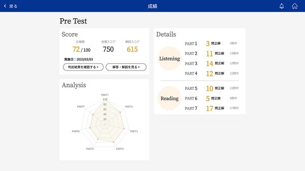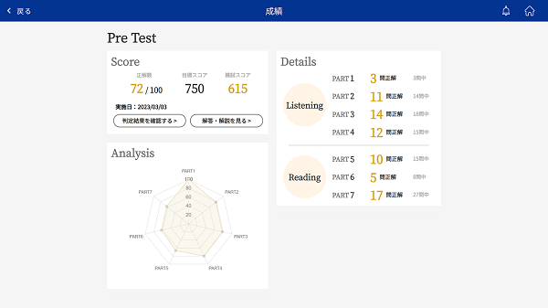 ▲模試では「模試スコア」やパート別の分析グラフ「Analysis」で課題点が明確に。