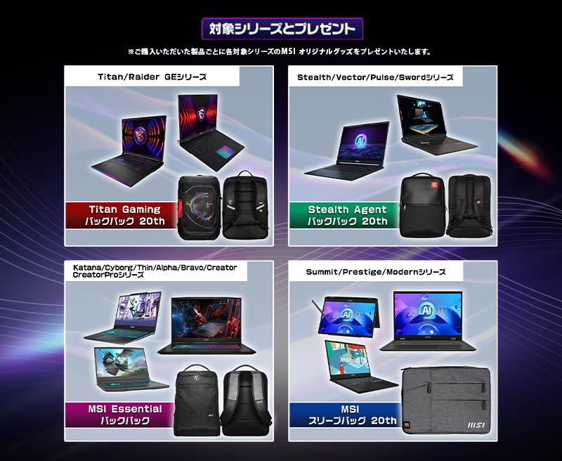 期間中、対象のMSIノートPC製品をご購入されたお客様に、もれなくMSIオリジナルバッグやMSIゲーミングデバイスをプレゼントいたします。