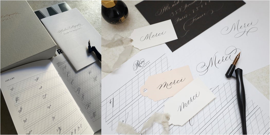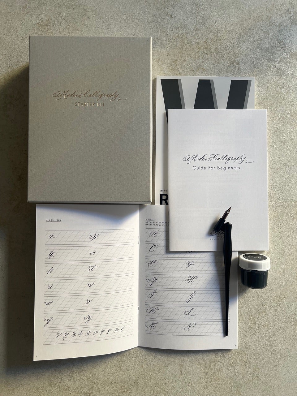 レッスンで使用するスターターキットは、東京九段下にあるステーショナリー専門店「Paper Tree(ペーパーツリー)」による監修のもと、“カリグラフィーを始めたいけど何から揃えたらいいのかわからない”という初心者の方におすすめのアイテムだけを揃えたコンパクトなセットです。基本アイテムに合わせて、角野梨沙氏によるガイドブックがセットとなり、基本のペンの使い方から文字を綺麗に書く・見せるためのポイントまでわかりやすく解説しています。