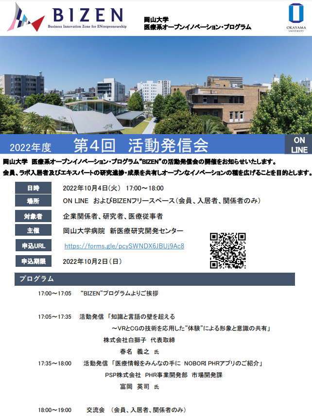 【岡山大学】岡山大学病院 医療系オープンイノベーション・プログラム「第4回BIZEN活動発信会」の内容動画を期間限定で公開