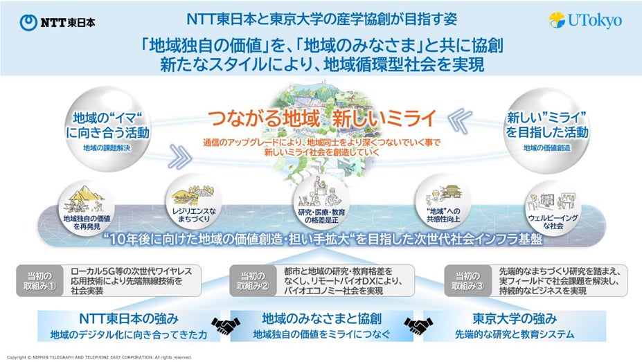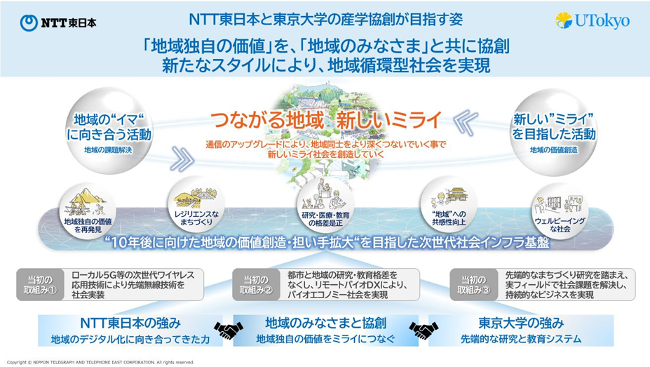 両者は「つながる地域 新しいミライ」をテーマに、東京大学の持つ多様で先端的な研究力や長い歴史のある教育システムと、NTT東日本の持つ地域密着のエンジニアリング力や先端的なネットワーク・技術力を活用したフィールドでの実践を通じて、これからの日本を支える、各地域が自律的に経済活動や日々の生活が営めるような自律型・分散型社会の主導に挑んでまいります。