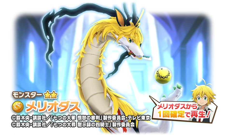 コラボモンスターにシンリュウ種「メリオダス・魔神」、ゲル種「エスカノール」、コラボアシストカードに「【たしかなぬくもり】メリオダス」、「【永遠の愛】バン」が登場