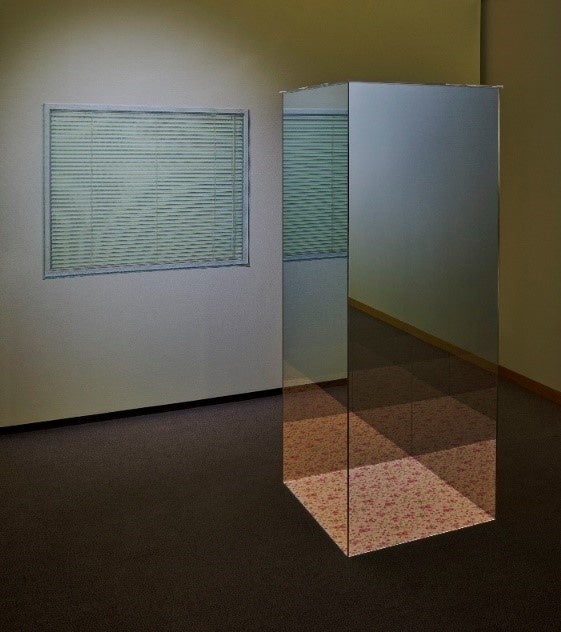 ハーフミラーを上手く活用して、見る者も写り込むことで作品に関与し、場が成立している。窓辺のブラインドはマスキングテープで作り、少し剥がれかけている。前者は物が有るのに無いように見え、後者はフェイクなのに遠くから見るとリアルである。その対比が面白い。実体とそうでないものの境目を身近な物で表現してみせており、また自由度のない展示空間を効果的に生かしていて、完成度が高い。理知的で破綻がなく、洗練された表現力が発揮されている。