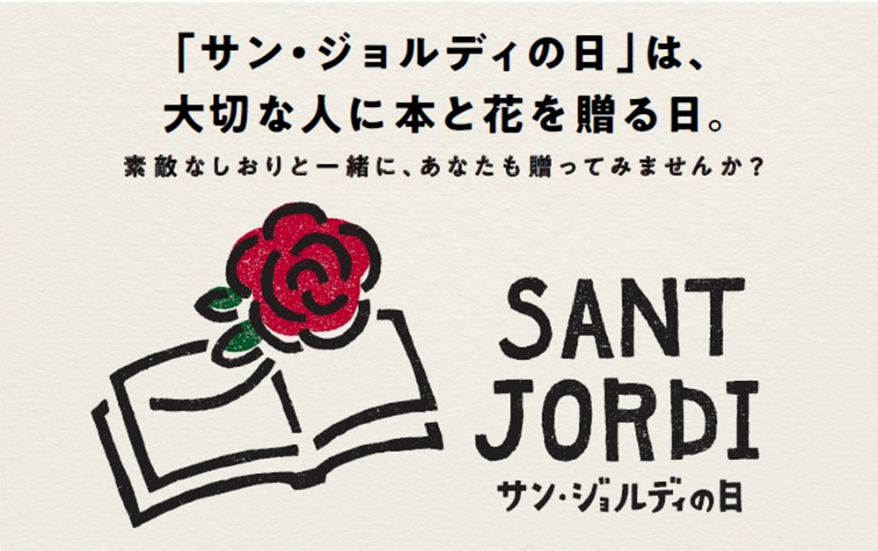 この⽇にはスペインでは、⼥性から男性へ本を、男性から⼥性へバラを贈る習慣があります。「バラ」はサン・ジョルディが⻯を退治した時に現れた⾚いバラに由来し愛の証として贈られ、「本」はスペインの名作『ドン・キホーテ』の著者ミゲル・デ・セルバンテスの命⽇に当たることに由来しています。現在では、家族や友人、恋人など親しい人へ本を贈る⽇として親しまれています。