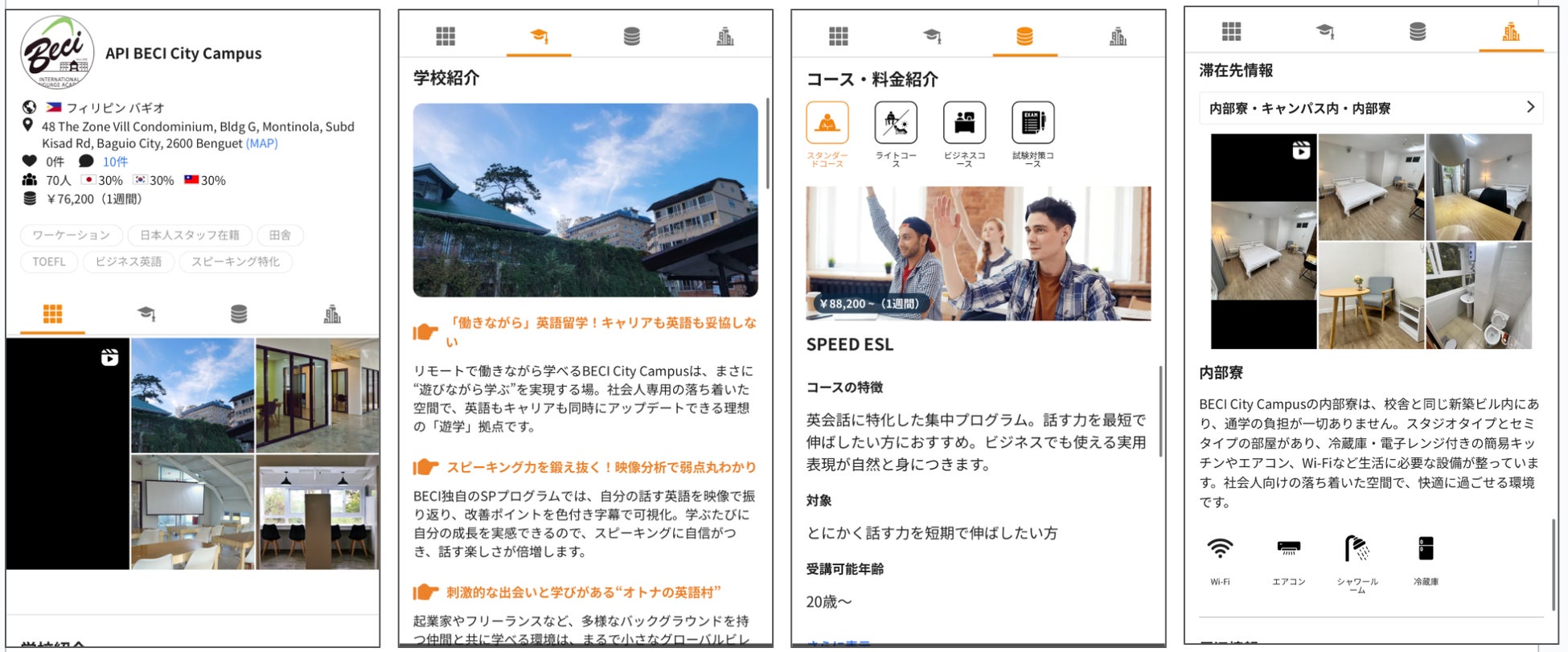 ネイティブキャンプ留学では、ユーザーが情報を分かりやすく把握できるよう、常に丁寧な情報提供を心がけています。API BECI City Campusの詳細情報は、以下の4つのカテゴリーに分けて掲載しており、知りたい情報を的確にお届けします。