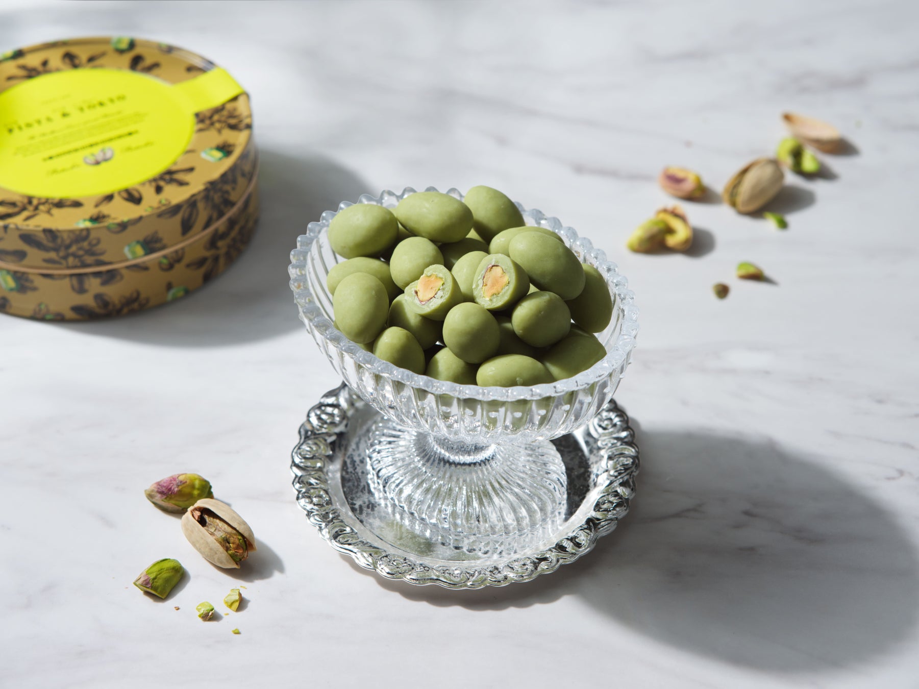 カリッと香ばしくローストしたピスタチオをピスタチオチョコレートで包み込んだ、美しい宝石のようなピスタチオショコラです。ピスタチオそのものの、濃厚で香り高い美味しさを1粒に閉じ込めました。オリジナル缶でギフトにもおすすめです。