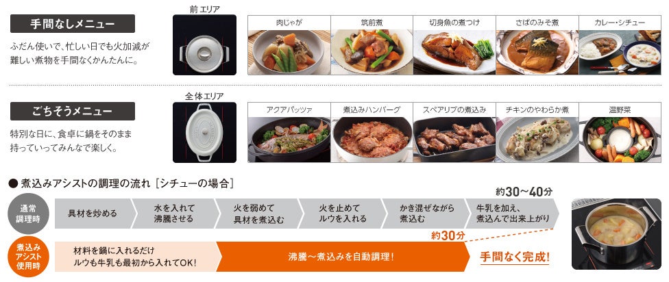 「煮込みアシスト」で、加熱中に火加減もかきまぜも不要なメニューを搭載