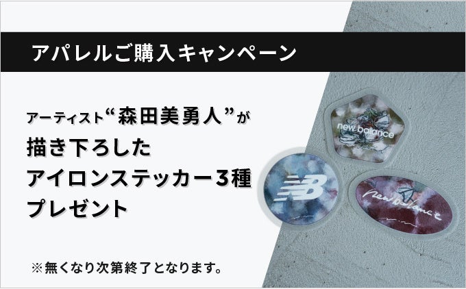 アパレル1点以上ご購入で、アーティスト森田美勇人氏がニューバランスのブランドカラーであるグレーと、女性の強さと優しさをイメージして描き下ろしたアイロンステッカー3種1セットを先着150名様にプレゼントいたします。アパレルだけでなく、どこに貼っても素敵なデザインに仕上げ、ちょうどよい存在感のサイズに仕上げたステッカーです。