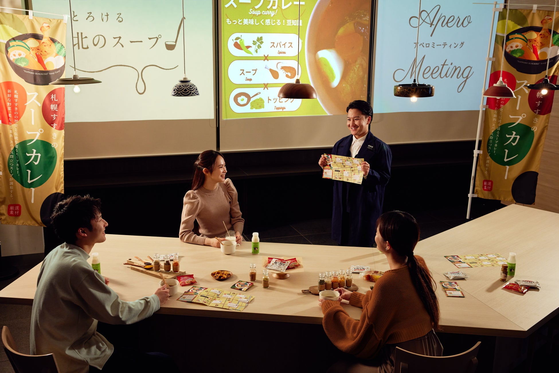 夕食前のひとときをお酒を飲みながらゆっくり過ごすフランスのアペロ文化にちなみ、ドリンクやスナック片手にスープカレーの魅力を余すことなく楽しめるプログラムを行います。スープカレーが誕生した背景や、すすきのの食を愛してやまないOMOレンジャーおすすめの店舗紹介など、実際にスープにスパイスアレンジを加えて試飲しながら楽しく学べます。話を聴いたら思わずスープカレーを食べに出かけたくなる仕掛けがつまったプログラムです。
