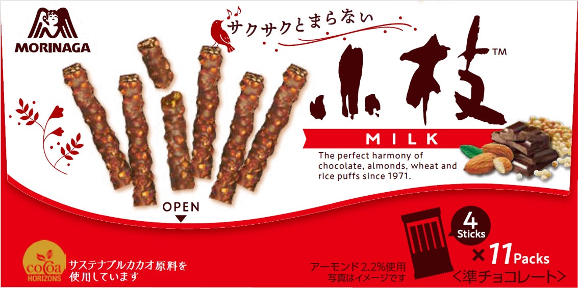 1971年に発売した森永製菓株式会社のロングセラー商品。具材とチョコレートのコンビネーションが特長の、枝の形をしたチョコレートです。チョコレートと焙煎アーモンド、2種類のパフとの組み合わせが絶妙で、小枝ならではの食感と味わいが楽しめます。