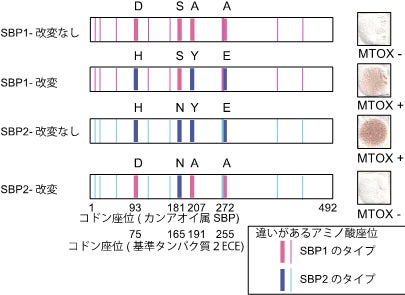 図7:トクノシマカンアオイ由来のSBP1とSBP2の3アミノ酸座位を入れ替えると酵素の働きが逆転する。図右側は酢酸鉛試験紙によるMTOXによる生成物(硫化水素)の検出結果。