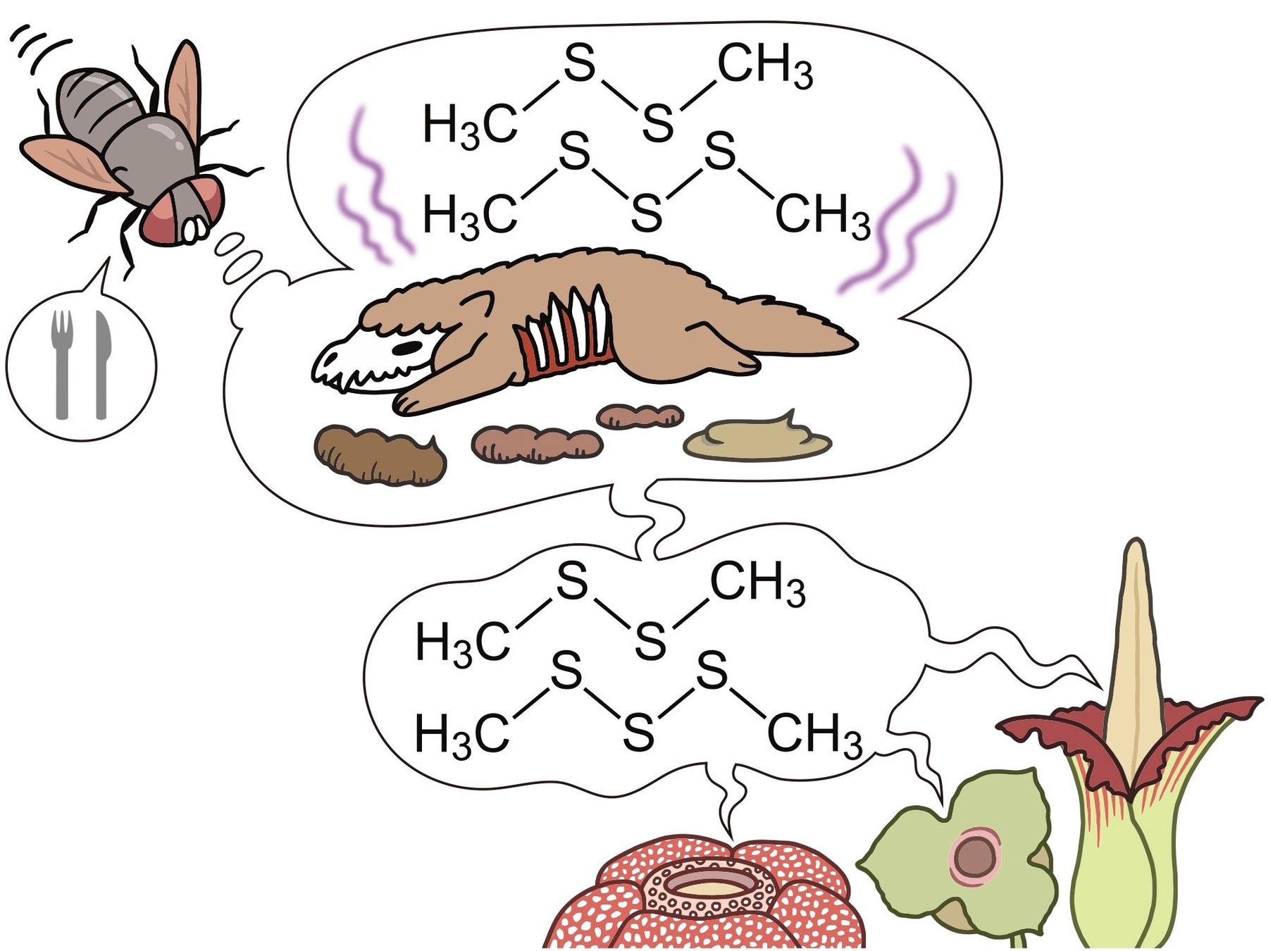 図1:腐肉擬態花の模式図。花からは腐った肉や肉食動物の糞から出るのと同じジメチルジスルフィド、ジメチルトリスルフィドといったにおい成分を放ち、花粉を運ぶハエなどの昆虫を誘き寄せる。