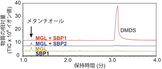 図5:カンアオイ属由来のMGLとSBPをメチオニンと反応させた生成物のガスクロマトグラム。メチオニンを基質とすると、MGL単独ではメタンチオールを生じる一方でDMDSはほとんど生じないが、SBP1はメタンチオールからDMDSを生成する。SBP2にはDMDSを生成する活性は見られず、別の実験からメタンチオールオキシダーゼ(MTOX)として働くことが分かった。