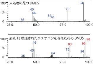 右下段のマススペクトルには未処理の花にはほとんどみられない80, 95, 96といった質量数のシグナル(赤数字)が存在することから、花に吸わせたメチオニン(炭素13標識されたもの)がジメチルジスルフィド(DMDS)に変換されたことが分かる。