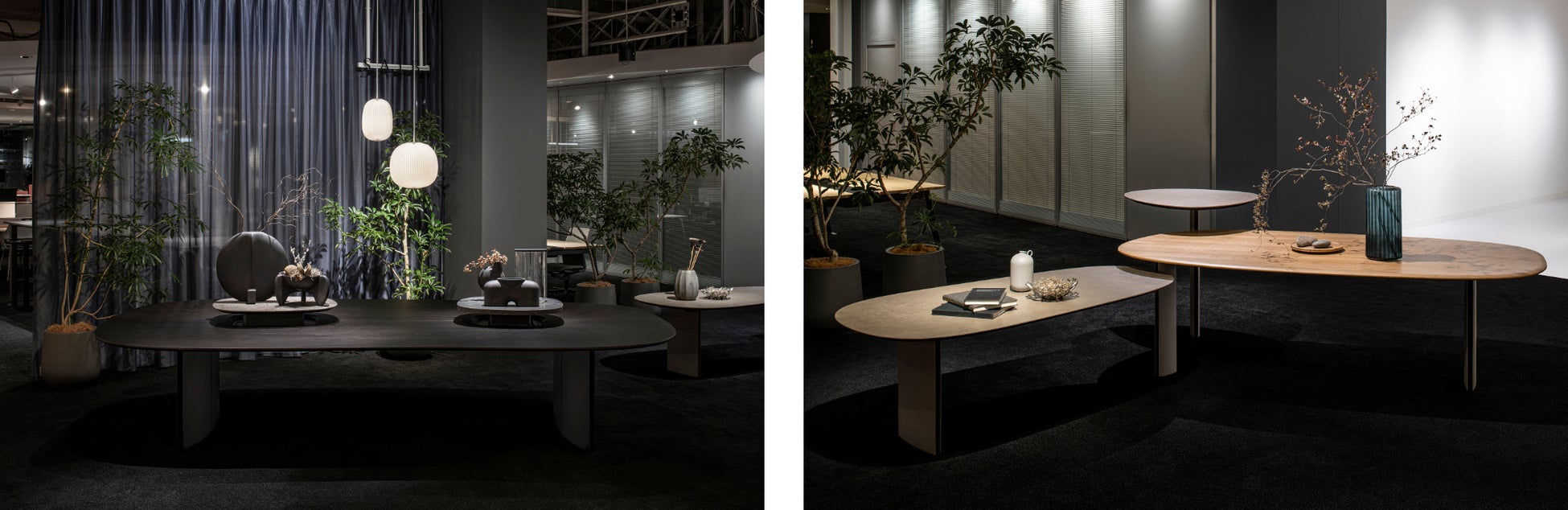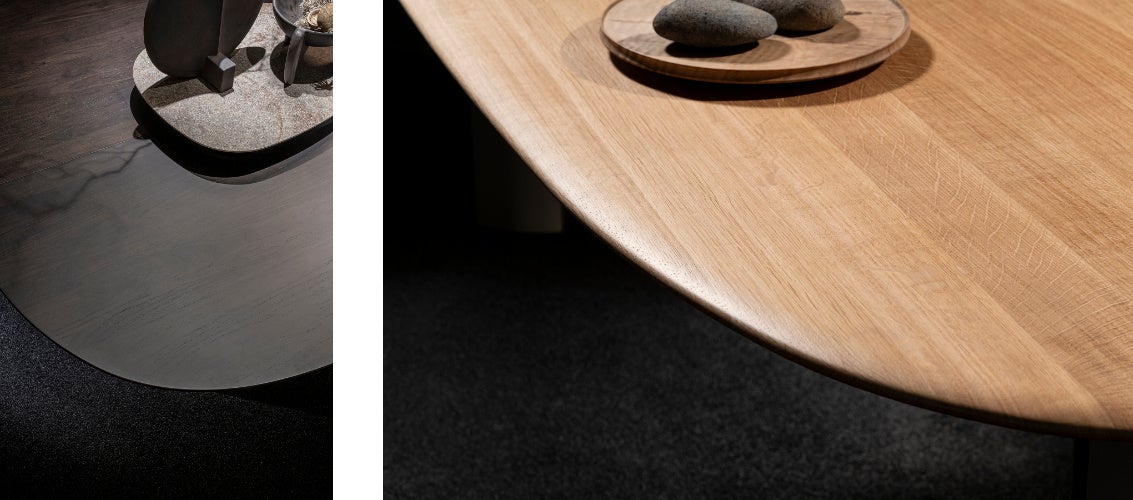 新たなコンセプト“Resonant Luxe(レゾナント リュクス)”のもとにつくり上げたデザインは、「上質なマテリアルと造形が響き合う空間が非日常感をもたらし、心が落ち着く。それは、新たな発想を生む広く深い思考へとつながっていく」。それがコンセプトに込めた想いです。天板のマテリアルは、現行シリーズと同じメラミンのほかに、リノリウムや突板、無垢材、セラミックなど、従来のオフィス家具には珍しいより感性的な素材を採用することで、温かみや手触り感を加えています。