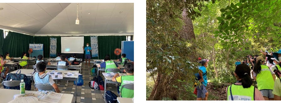 その後は、真鶴町の豊かな海の源でもある、県内唯一の魚つき保安林である「お林」の見学に出発!江戸時代に人の手で作られたお林には、クロマツ、クスノキ、スダジイなどの巨木が点在しており、その大きさに子ども達は大興奮!見学を終えるころには、3種類の木の見分け方をマスターするほど!陸から海へ続く自然観察を通じて、真鶴の海の豊かさは山から恩恵を受けていることを肌で感じたようです。