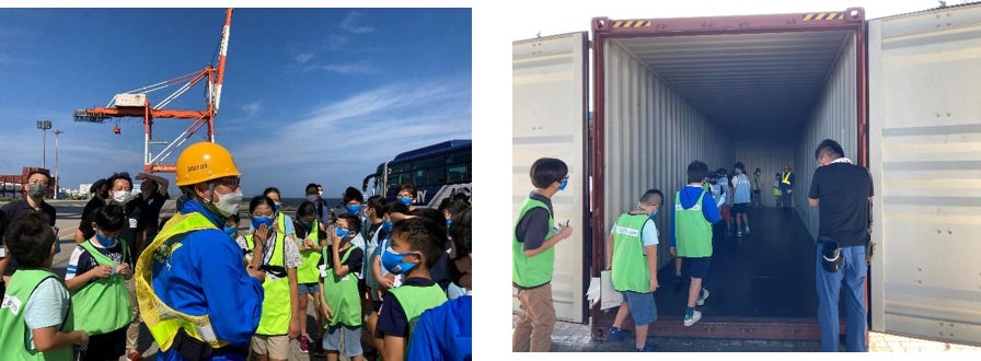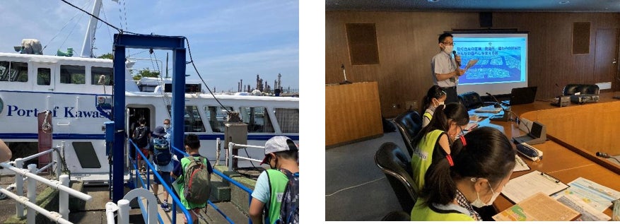 続いて、川崎市港湾局の末繁さんに川崎港の成り立ちについて学びます。川崎港では昔、海苔づくりなど漁業が行われていましたが、大正時代から始まった埋め立てによって、国際貿易港へ発展することになりました!その埋め立てを最初に行ったのが浅野総一郎です。日本の貿易の発展のために大型船が着岸できるよう東京湾を改造したことに、子ども達は驚いていたようです。今後も川崎港の埋め立ては続くそうで、国際貿易港としての挑戦は続いていきます。
