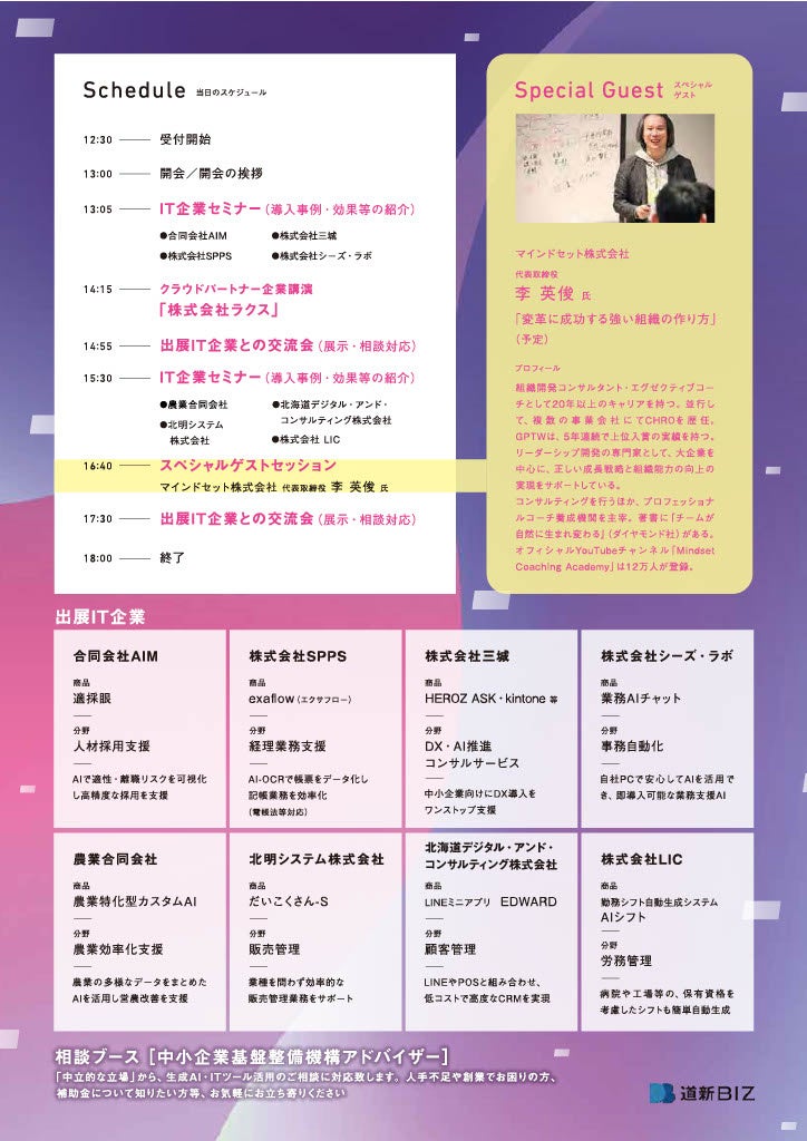 本セミナーでは、ITに詳しくない地方の中小企業に寄り添う学校「DX学校」を運営する(株)ディグナ代表取締役・DX学校校長の梅崎 健理氏による企業・組織のデジタル化をテーマとした基調講演や、人材採用・労務管理・経理業務・販売管理・顧客管理、AIによる事務自動化等、幅広い業務に関する商品を提供するIT企業による導入事例の紹介や商品展示、北海道ITコーディネータ協議会の専門家による相談対応などが行われ、様々な商品・サービスについて理解を深めることができ、相談も可能な機会となります。