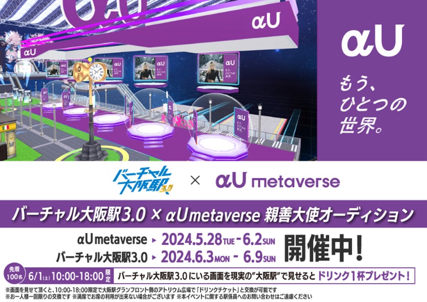 この出展を記念して、メタバース内でのカラオケや配信イベントの他、メタバース参加でリアルの大阪駅でドリンクがもらえる特典など、バーチャル上とリアルが連動するイベントを実施しております。αUによる空間ジャックでガラリと雰囲気が変わる「バーチャル大阪駅 3.0」をぜひお楽しみください。