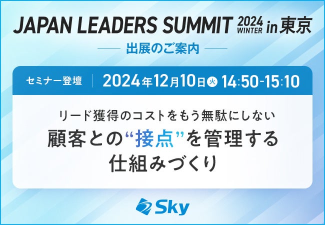 Sky株式会社は、2024年12月10日(火)にコンラッド東京で開催される、 “No.1”を目指す上で求められる戦略をお伝えするカンファレンス形式のイベント「JAPAN LEADERS SUMMIT 2024 冬 in東京(主催:スマートキャンプ株式会社)」に出展いたします。
