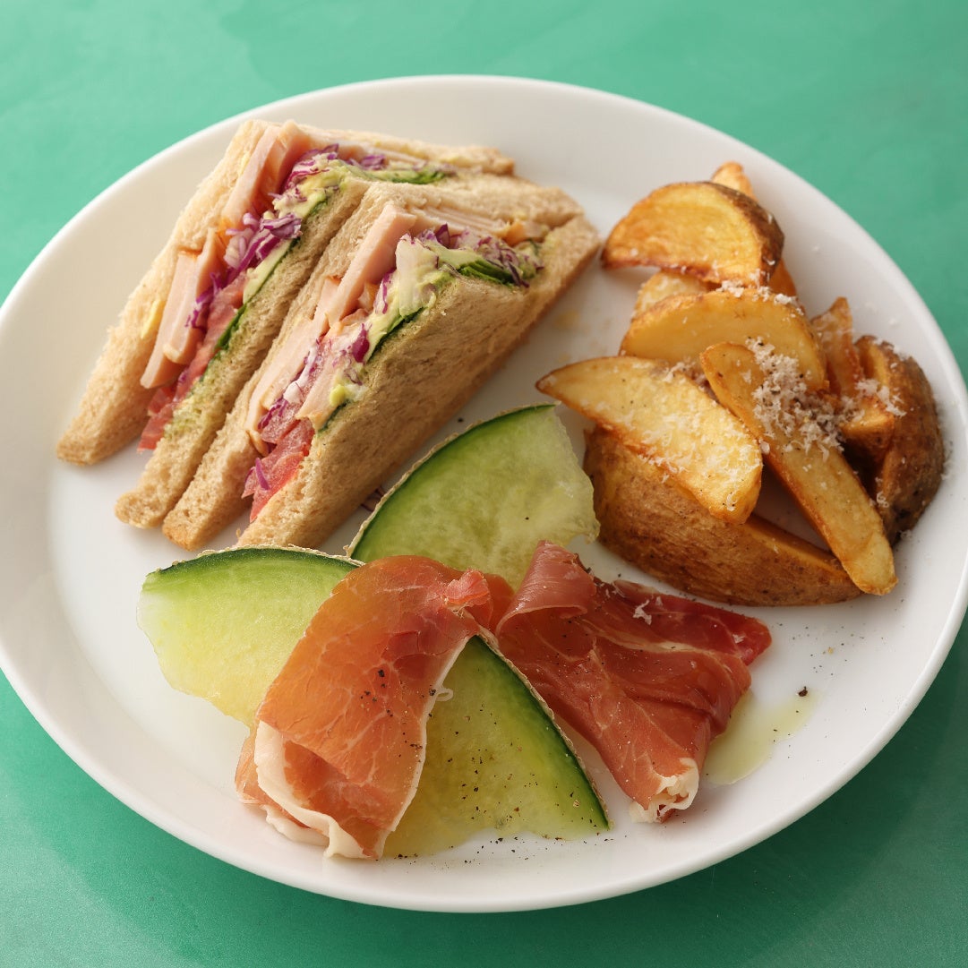 3段目にはワインによくあうセイボリーが登場。甘みと塩味のバランスが絶妙な「生ハムメロン」、やわらかく味わい深い伊達鶏を全粒粉のパンで挟んだ「スモークした伊達鶏とアボカドのサンド」などをご用意しました。