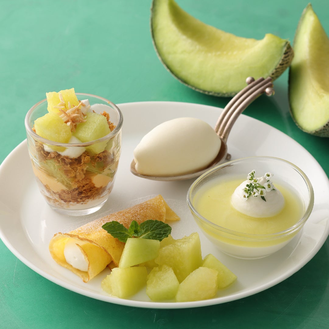 2段目にはヨーロッパで親しまれる伝統的なスイーツをココナッツでアレンジした「メロンとココナッツのブランマンジェ」などが登場。“イバラキング”の爽やかな甘さやなめらかな果肉、上品な香りを堪能できるラインアップです。