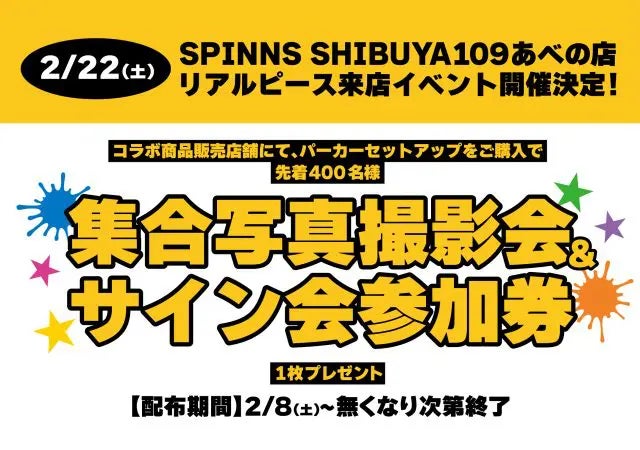 ・対象店舗にてコラボ商品のパーカーセットアップをご購入で、先着400名様に2月22日あべのキューズモール スカイコートで使える『集合写真撮影会&サイン会参加券』をレジにてお渡ししておりますので必ずお受け取り下さい。