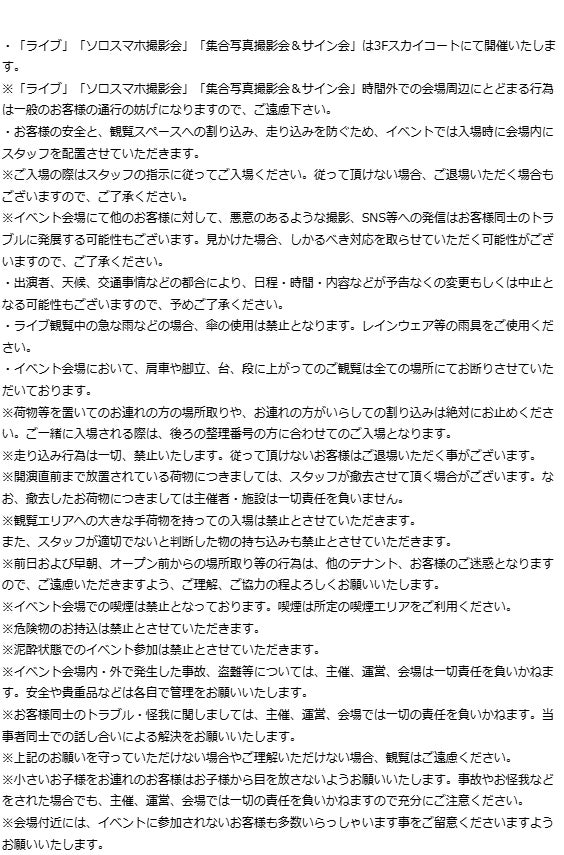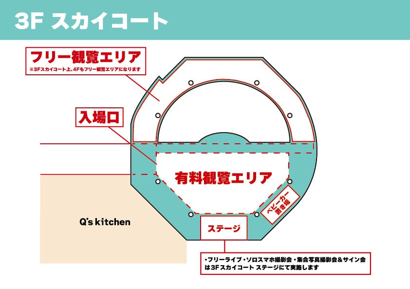 ※当日は会場混雑が予想されるため、3Fスカイコートの入場規制を行う場合がございます。なお、4F吹き抜けスペースについても会場の入場可能人数を超える場合、やむを得ず入場規制をかける可能性がございます。イベントの安全な運営に皆様のご協力をお願いいたします。
