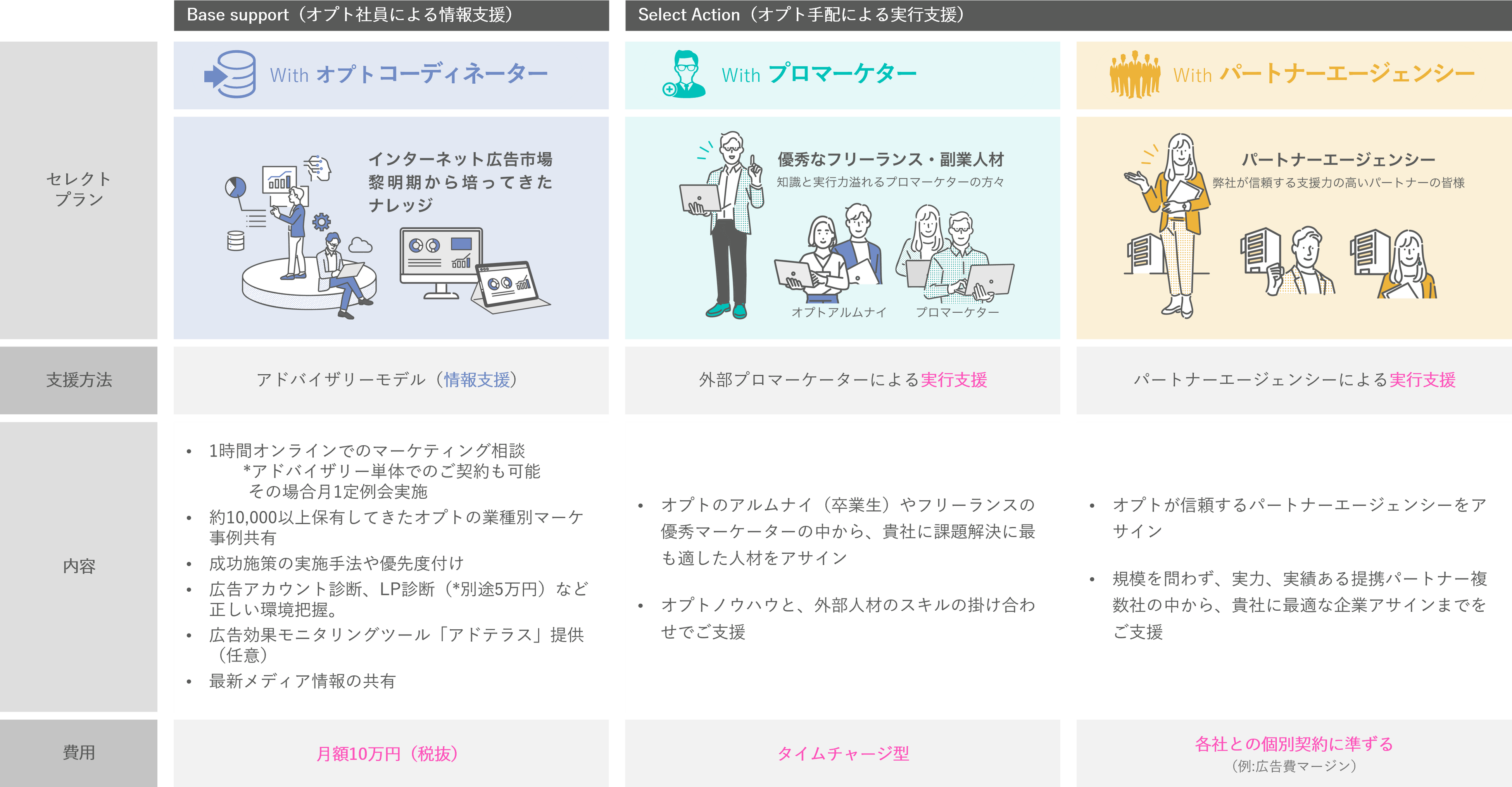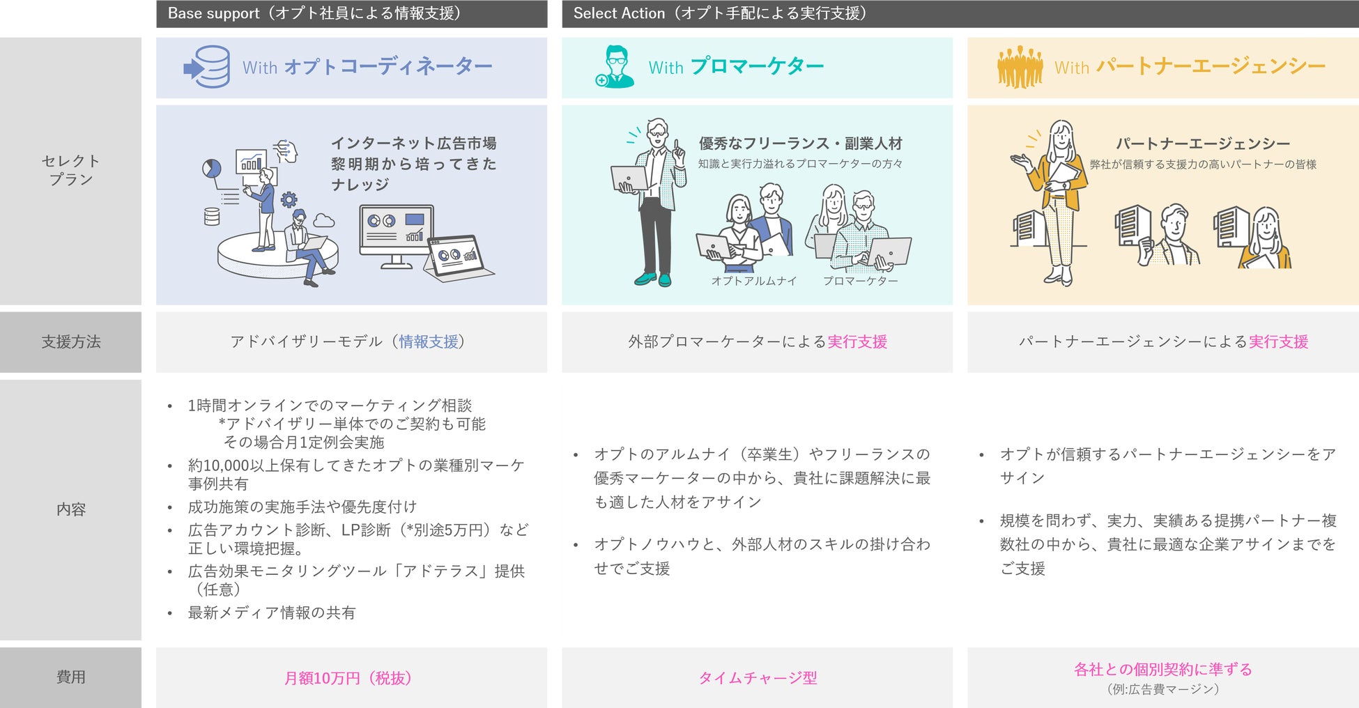 さまざまな企業のデジタルマーケティングに長年携わってきたオプトの「コーディネーター(※4)」が、オプトのナレッジをもとに、顧客企業のマーケティング課題にあわせ、オプトコミュニティに属している、アルムナイやフリーランスを顧客企業のマーケティングチームの一員としてアサインまたは、パートナーエージェンシーをマッチングする新たなサービスです。