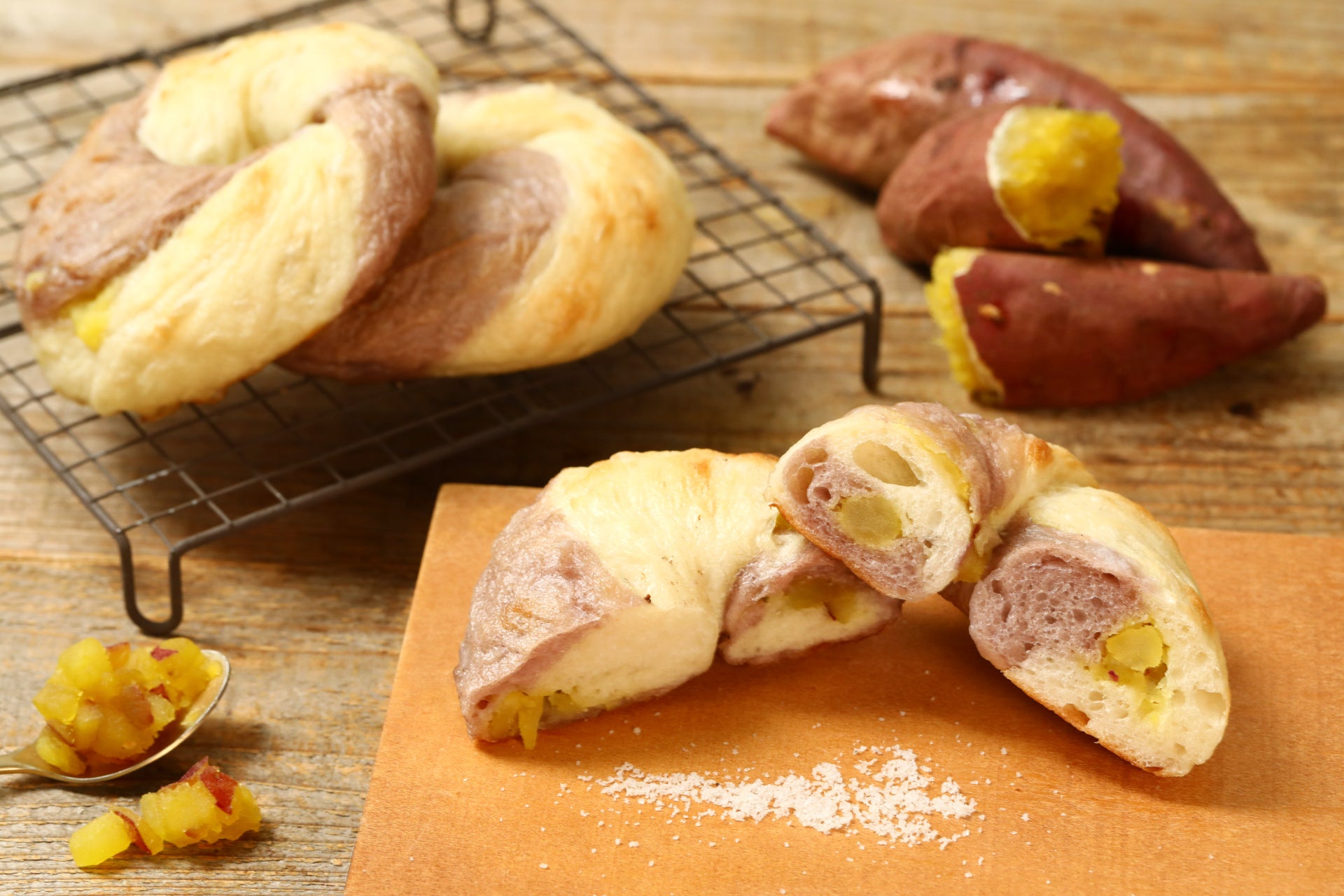 こだわり:紫芋の粉末を練りこんだ生地とプレーン生地のツートーンカラーが目を引く秋のベーグル。