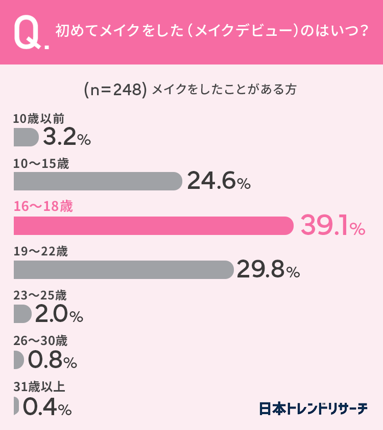 【メイクデビューはいつ?】39.1%が、初めてメイクしたのは「16~18歳の時」
