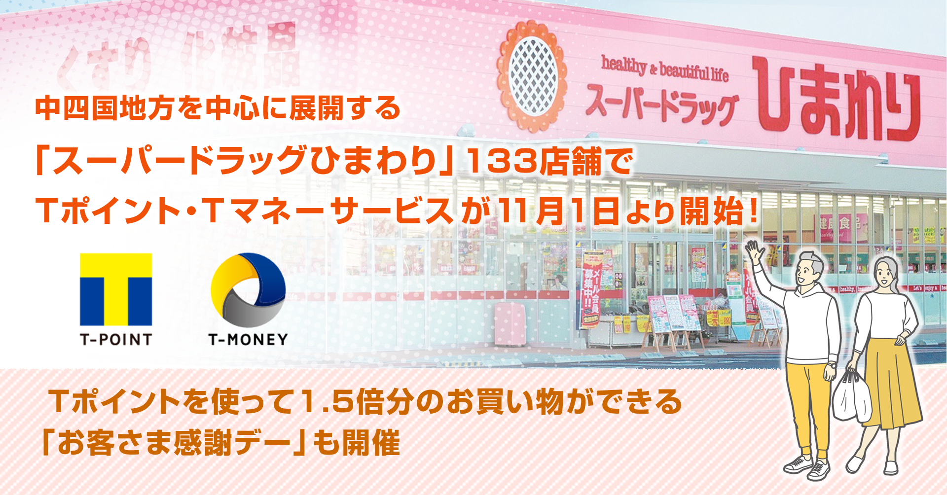 中四国地方を中心に展開する「スーパードラッグひまわり」133店舗でTポイント・Tマネーサービスが11月1日より開始!