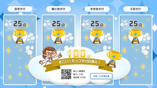 モップを使った清掃方法である、「歩きがけ」「横どめがけ」「すきまがけ」「S字がけ」の4つの動きを通じて、ホコリを舞い上げにくい掃除方法を学ぶことができ、体験後に採点結果が二次元コードとともに表示されます。その二次元コードを読み取ることで結果をダウンロード・保存することもできます。