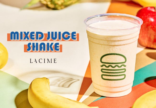 「ミックスジュースシェイク」は、世界で活躍する人気シェフとシェイク シャックがコラボレーションする人気企画“シェフコラボ”のメニューとして、大阪に店舗を構えるミシュラン2つ星レストラン「ラシーム」の高田裕介シェフがプロデュースしました。ラシームで提供する定番の“ミニャルディーズ”(一口サイズのデザート)から着想を得たシェイクは、バナナ、みかん、黄桃、パイナップルなどの多彩なフルーツに加え、リンゴやレモンの果汁を使用しています。数種類のフルーツや果汁をクリーミーなバニラフローズンカスタードにミックスする事で、フルーティーでまろやかな味わいがお楽しみいただけます。