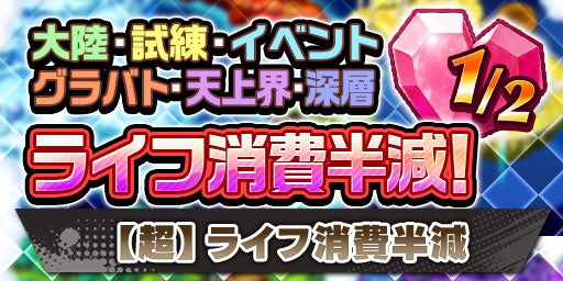 期間中、大陸・試練・イベント・グランバトル・天上界・深層で消費するライフが半減されます。
