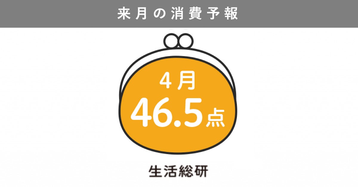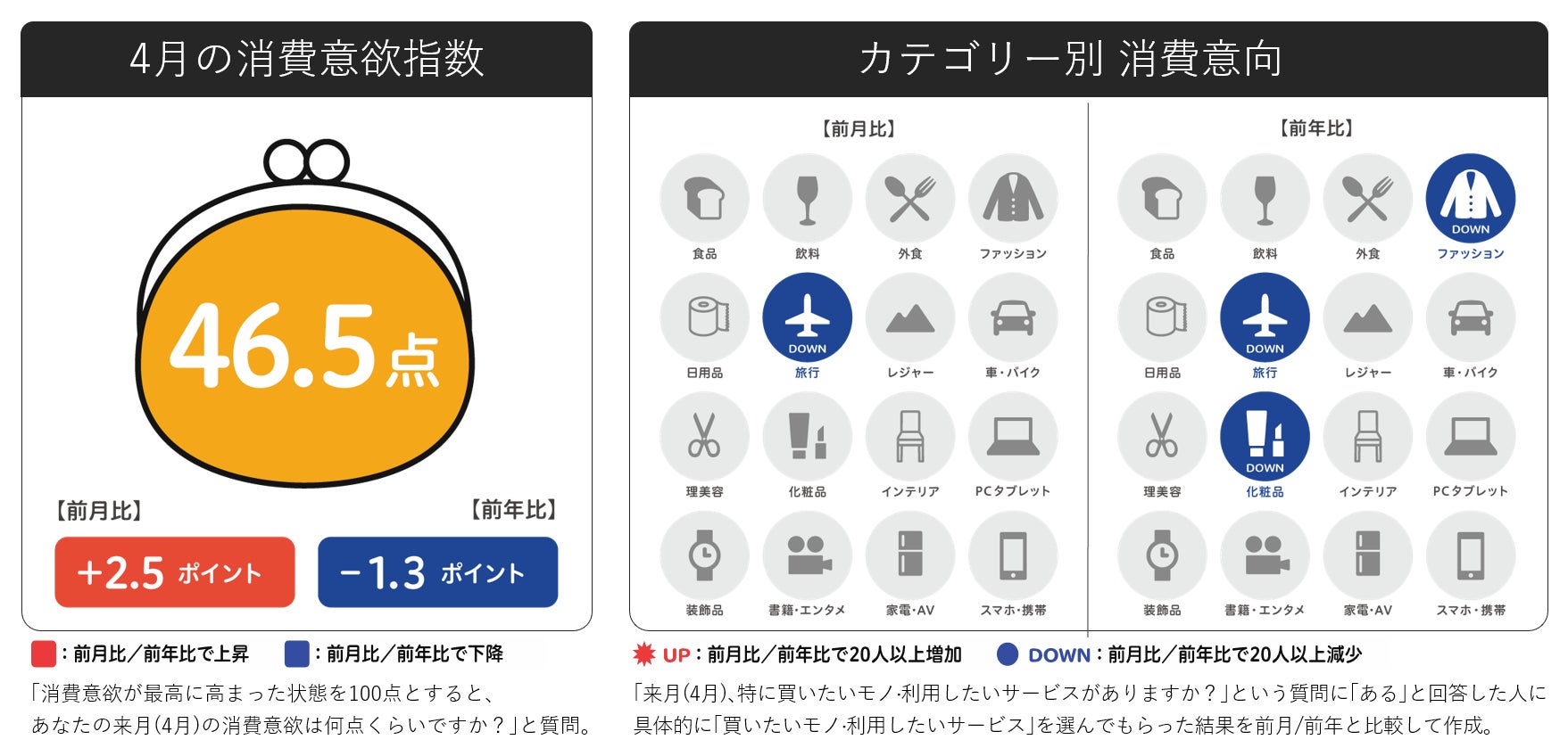 2025年4月の消費意欲指数は46.5点。前月比では+2.5ptと上昇し、前年比では-1.3ptと低下しました。