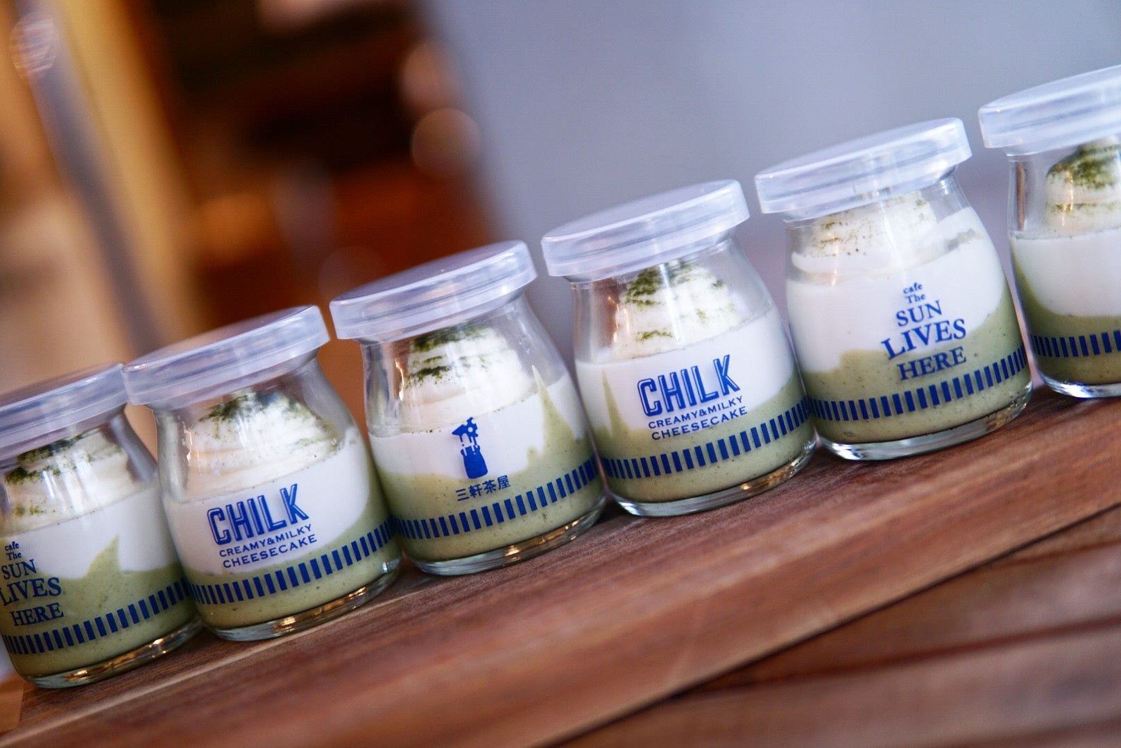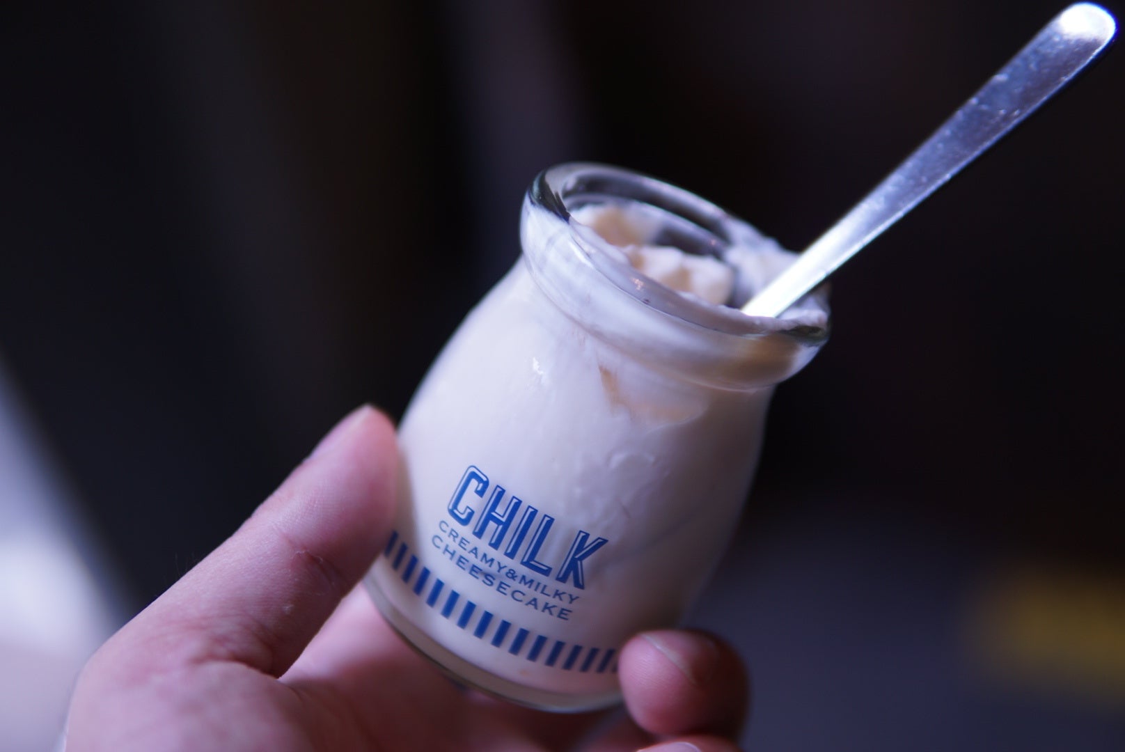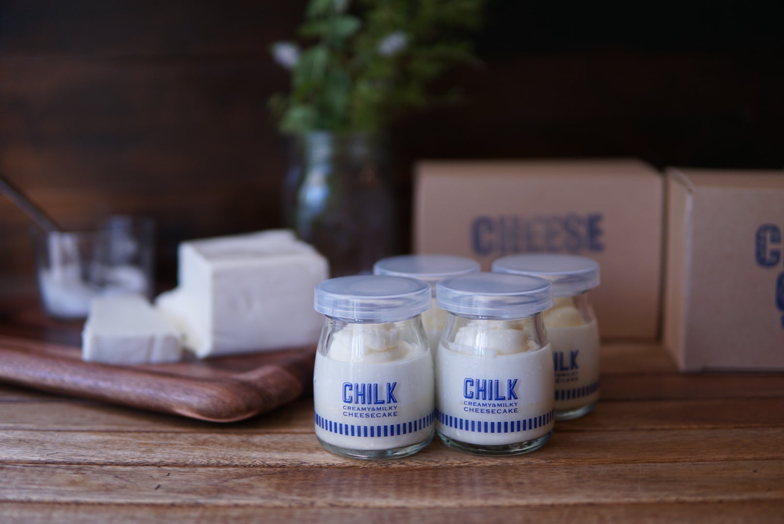 看板商品のCHILK(チルク)は、瓶詰めされたコロンとした見た目のチーズケーキ。中は三層となっていて、スプーンひとすくいするごとに3種類の味がお楽しみいただけます。
