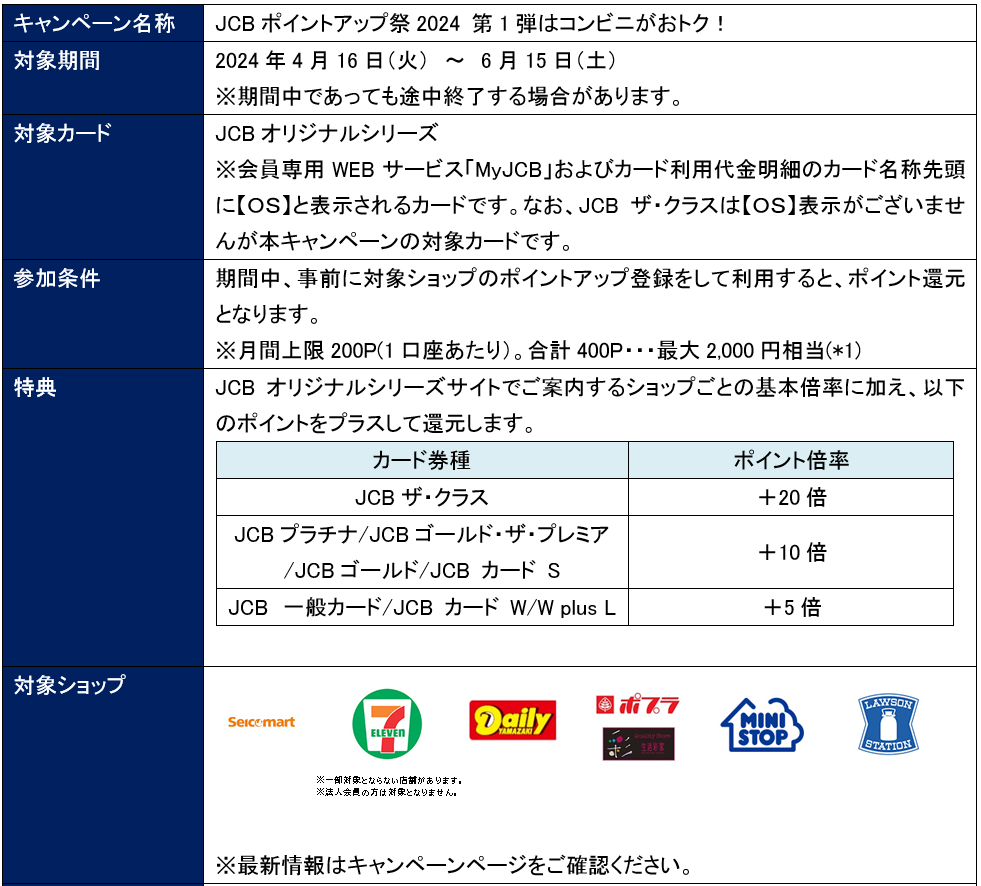 株式会社ジェーシービー (本社:東京都港区、代表取締役兼執行役員社長:二重 孝好、以下:JCB)は、「JCBオリジナルシリーズ」限定の優待店を対象としたポイント高倍率キャンペーン「JCBポイントアップ祭」を2024年度も開催します。