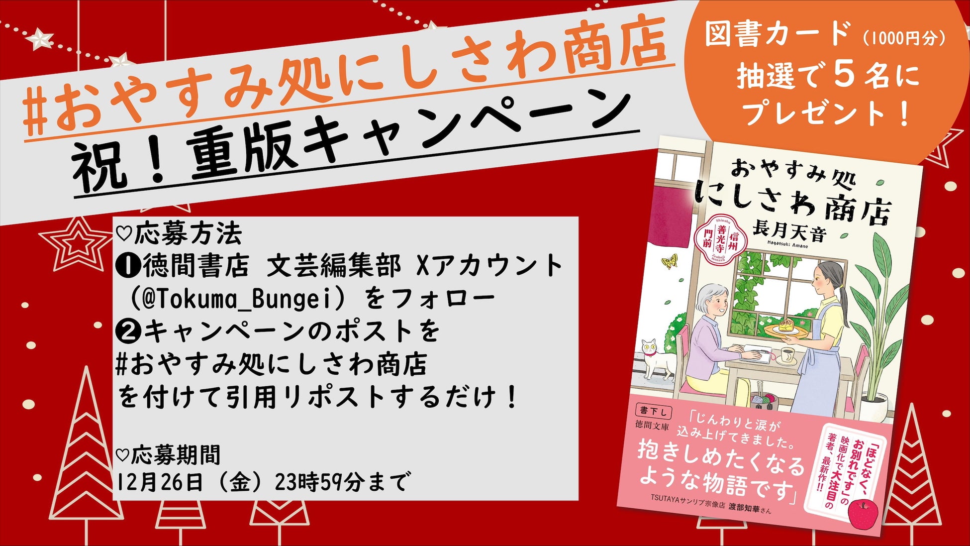 株式会社徳間書店(本社:東京都品川区上大崎 代表取締役社長:小宮英行)は、予約好評につき『信州善光寺門前 おやすみ処にしさわ商店』(長月天音/著)の発売前重版が決定したことをお知らせいたします。