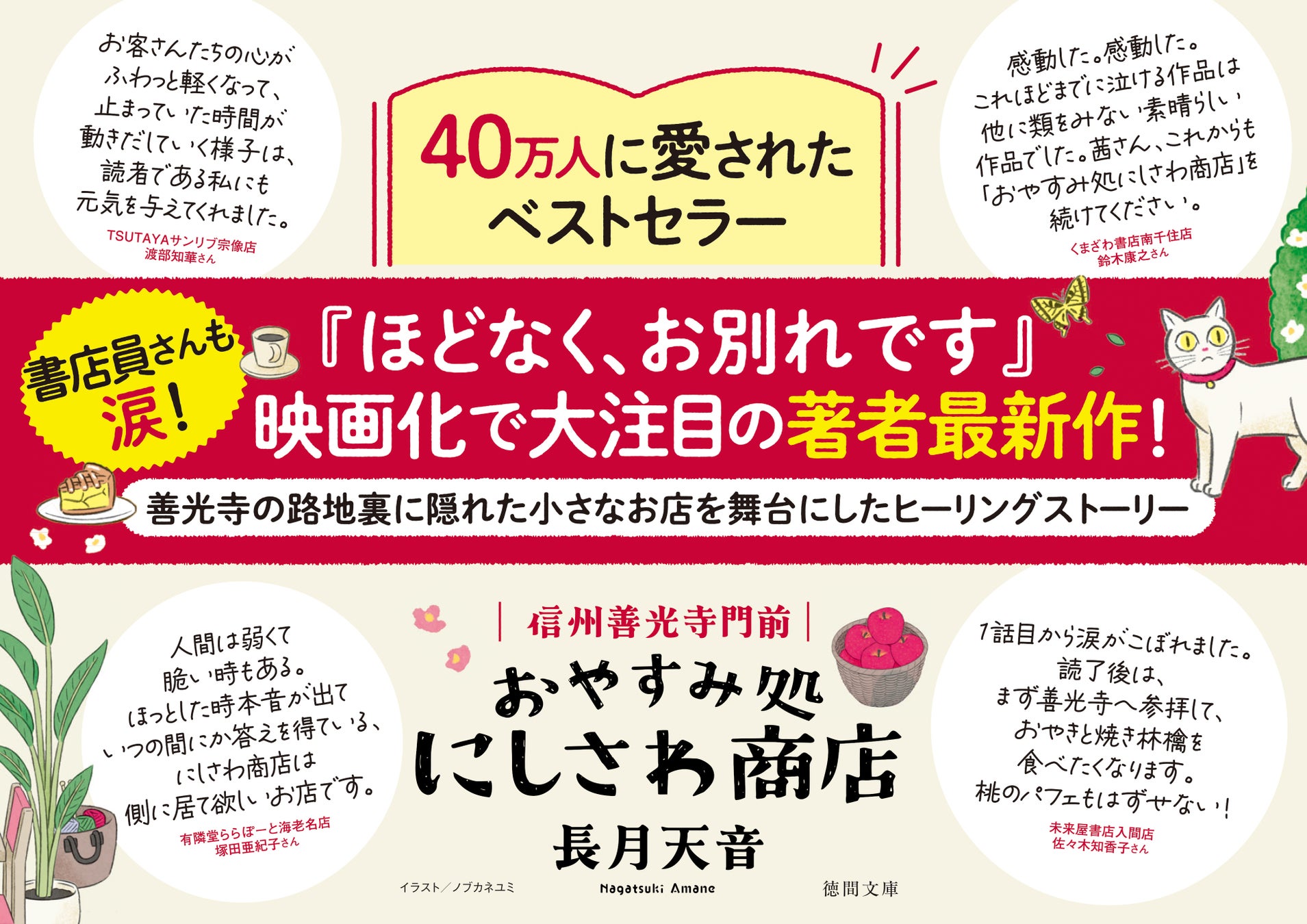 【発売前重版決定!】「ほどなく、お別れです」映画化で話題の著者が贈る最新ヒーリングストーリー『信州善光寺門前 おやすみ処にしさわ商店』長月天音 著 12月10日(水)発売