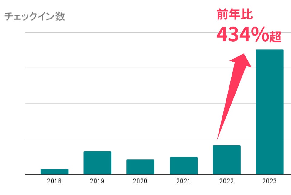 2023年の成長の要因は、ポストコロナの年となり訪日客(インバウンド)と国内客の両方が回復したことが大きく影響します。結果として、チェックイン数は前年比434%となり、観光需要が大幅回復による宿泊数の増加となりました。