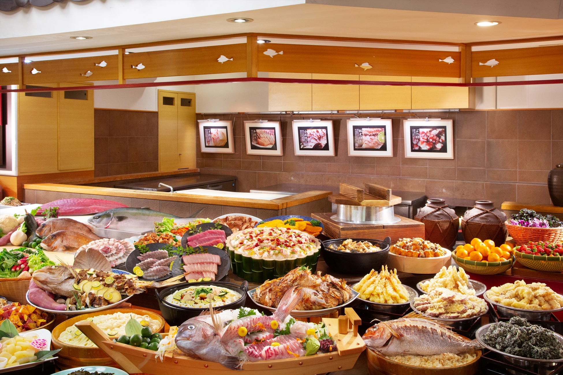 阿波の城下町をイメージした店内には、ライブキッチンがあり、ランチ60種、ディナー90種以上が味わえます。鳴門鯛やブリなどの造り、寿司、炭火焼、蒸し料理、鳴門わかめ、なると金時、淡路島玉葱などの揚げたて天婦羅からデザートまで揃います。