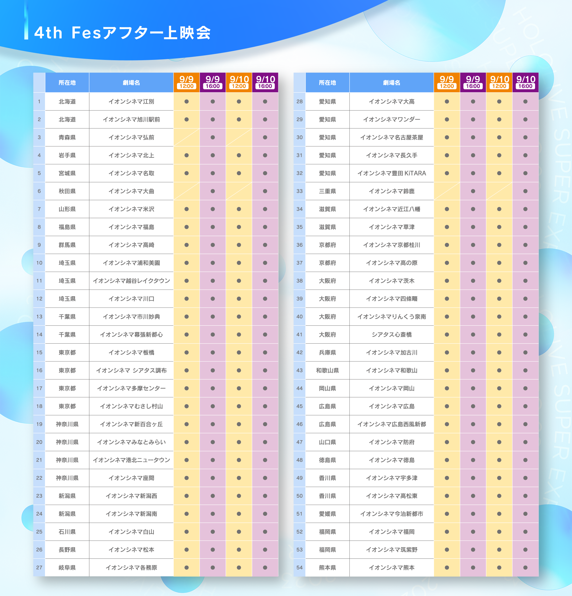 全国54館にて2日間にわたって開催されます。また、DAY1、DAY2出演タレントから各日2名、上映限定コメント映像も流れる予定です。是非劇場でお楽しみください!