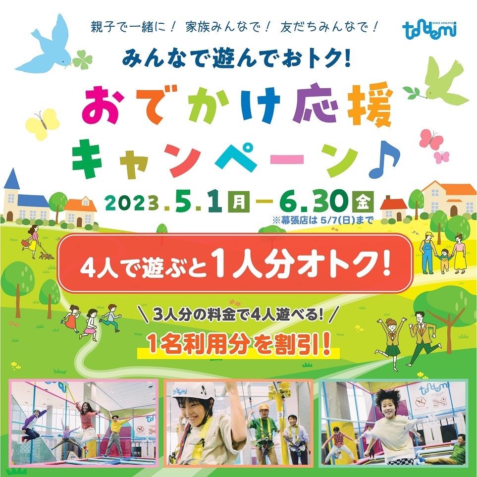 株式会社バンダイナムコアミューズメントは、全国の屋内アスレチック施設『トンデミ』にて、2023年5月1日(月)~6月30日(金)の期間、4人ごとに1人分オトク※1になる「おでかけ応援キャンペーン」を実施します※2。