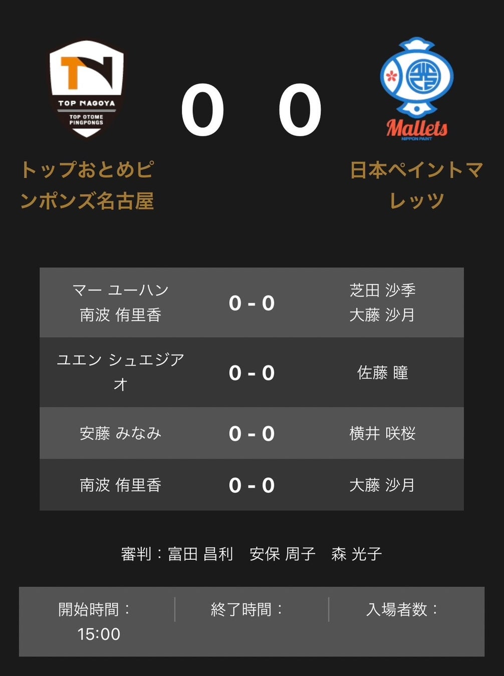ノジマTリーグ 2023-2024シーズン 公式戦 8月5日開催 トップおとめピンポンズ名古屋vs日本ペイントマレッツ 対戦オーダー発表の発表をします。