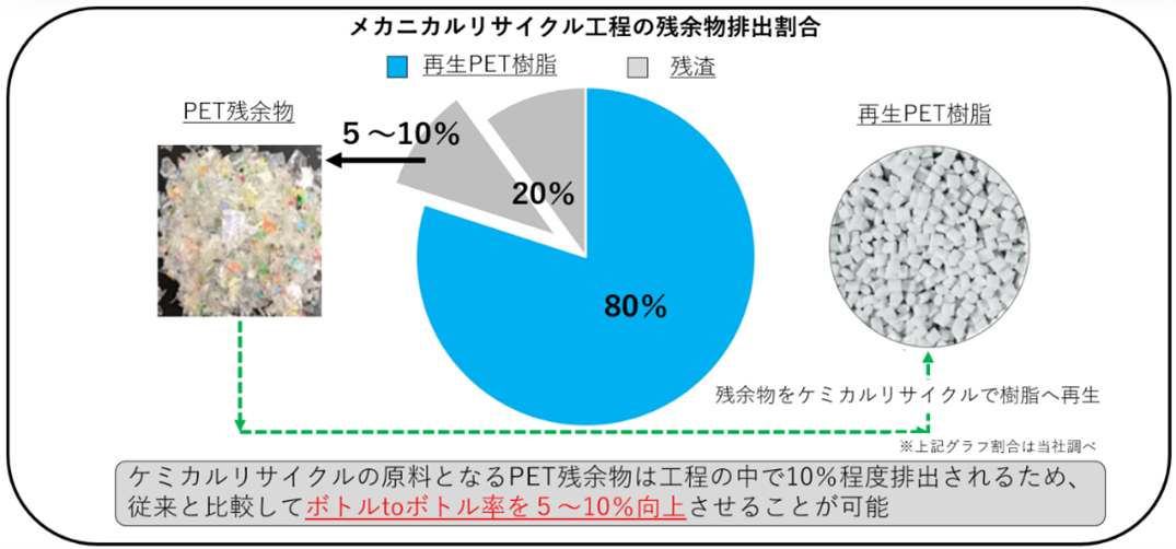 メカニカルリサイクルではリサイクルの工程で約20%の残渣が発生しますが、そのうち5~10%の残余物はペットボトル以外のものへのリサイクルが主となっています。残余物の一部にはペットボトル素材が含まれているため、残余物もペットボトル原料に再生することで、効率的かつ持続的なリサイクルが実現できます。
