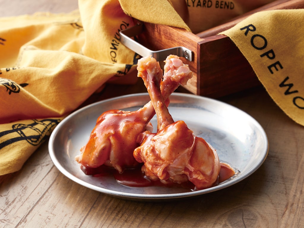 骨付きのチキンを甘味の効いたバーベキューソースに漬け込みました。